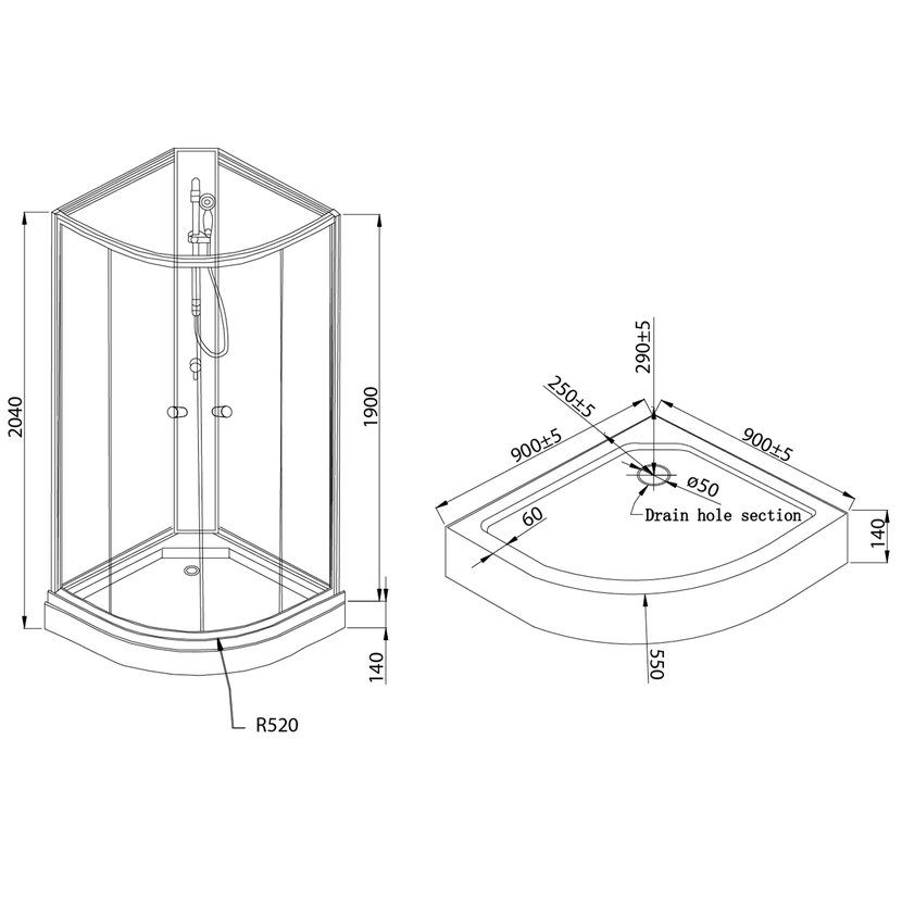 Parametry produktu  AIGO čtvrtkruhový sprchový box 900x900x2040 mm, bílý profil, čiré sklo