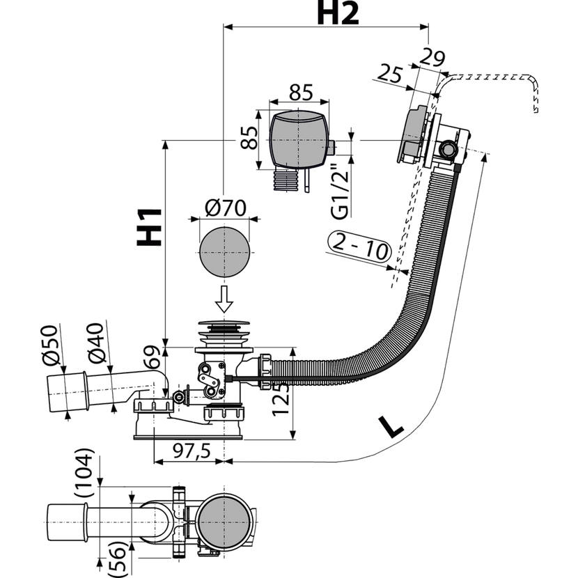 Alcadrain A566-273133-120 Sifon vanový s napouštěním přepadem pro hydromasážní vany, kov
