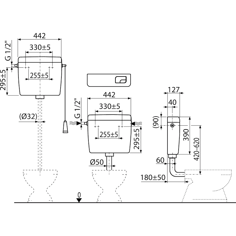 • Splachovací set pro vysoko položenou nádržku (šňůrka, držátko, páka)