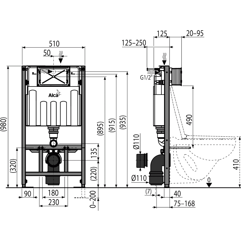 - Pro montáž závěsného WC s připojovací roztečí 180 mm nebo 230 mm