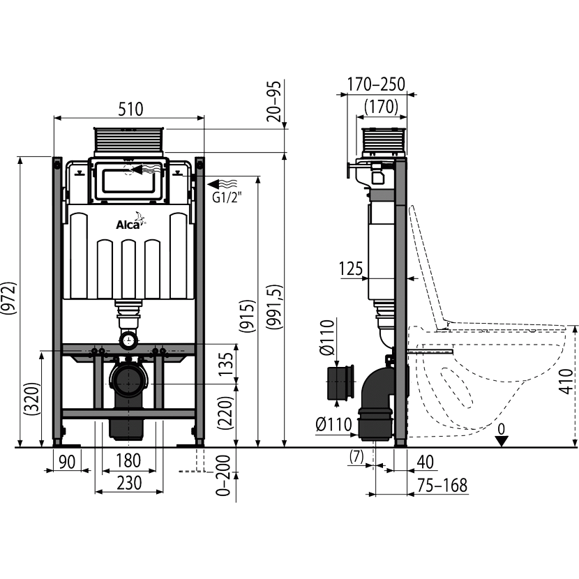 - Pro montáž závěsného WC s připojovací roztečí 180 mm nebo 230 mm
