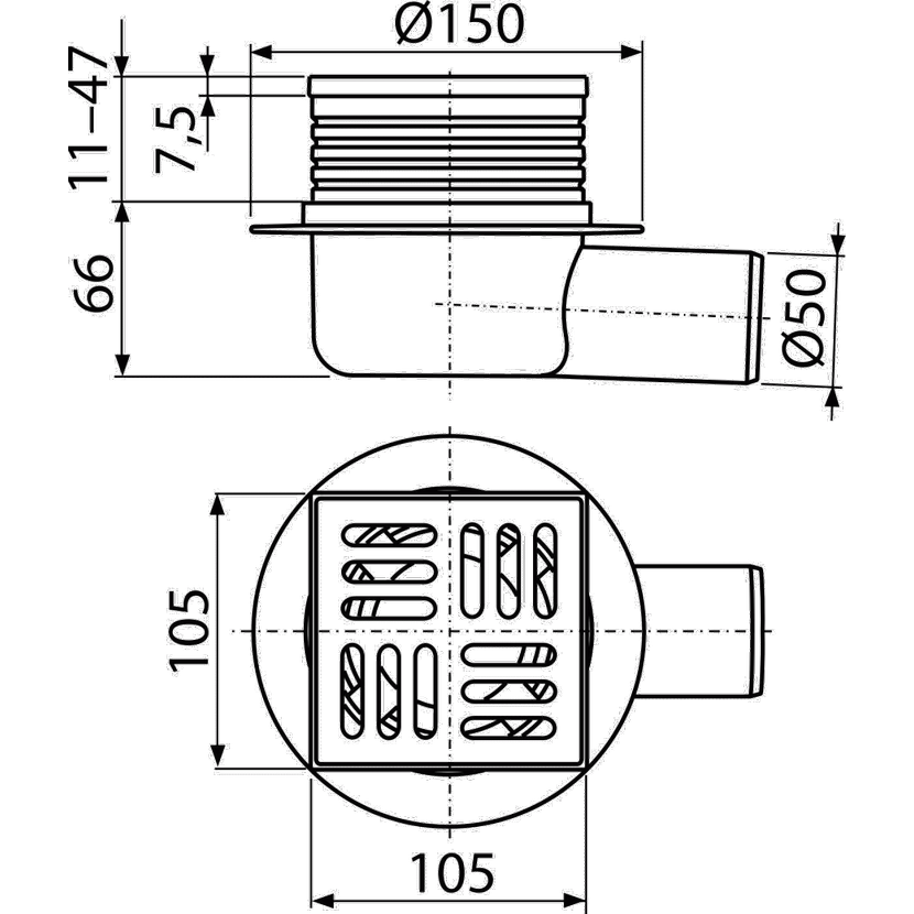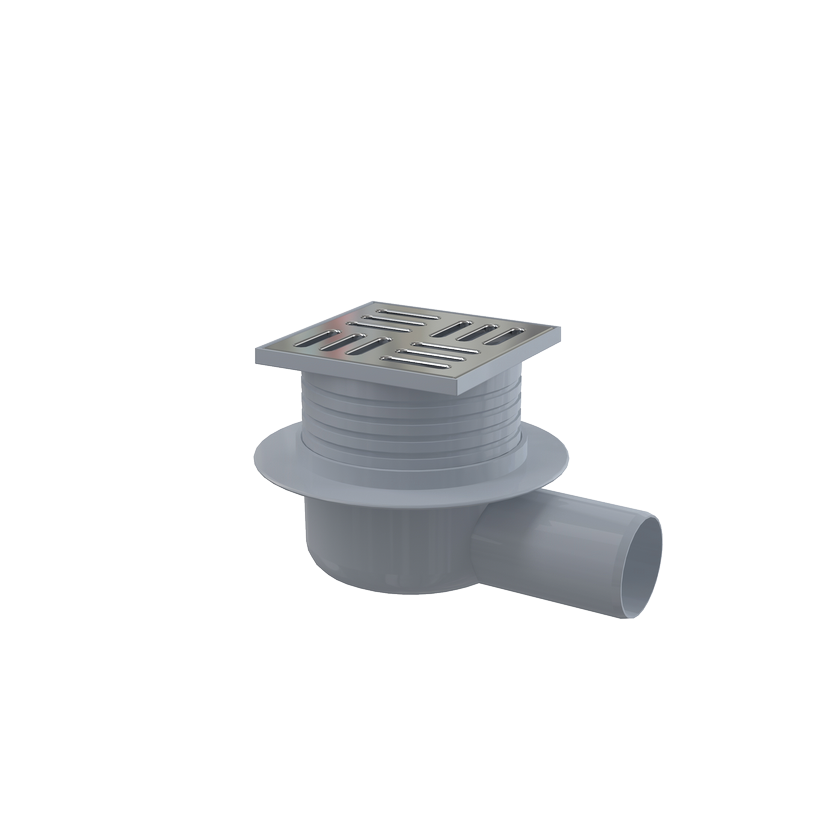 Alcadrain APV26 Podlahová vpust 105×105/50 mm boční, mřížka nerez, vodní zápachová uzávěra