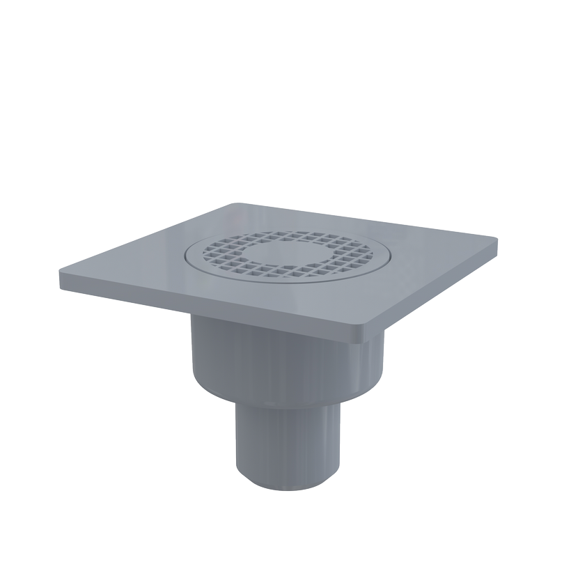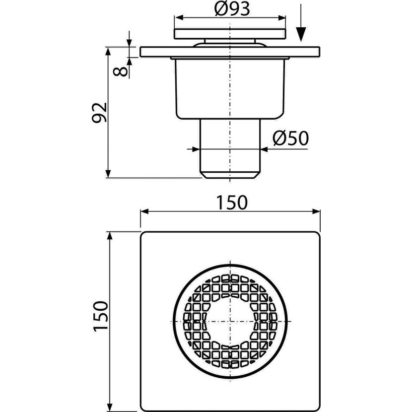 Alcadrain APV4 Podlahová vpust 150×150/50 mm přímá, mřížka šedá, vodní zápachová uzávěra