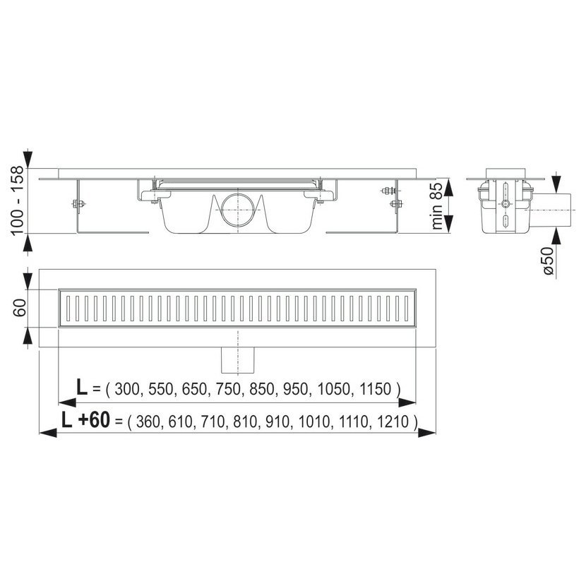 Parametry produktu  Alcadrain APZ1-1150 liniový podlahový žlab nerez