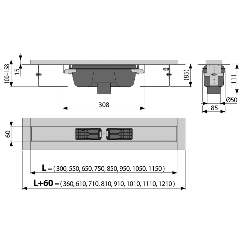Parametry produktu  Alcadrain APZ1001-750 Podlahový žlab s okrajem pro perforovaný rošt, svislý odtok