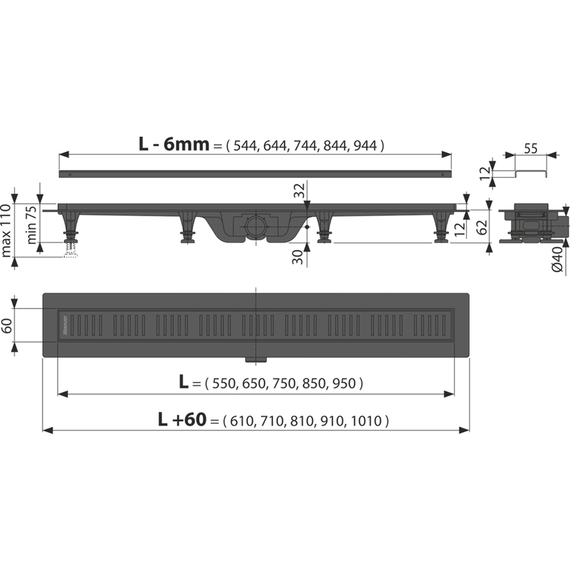 Parametry produktu Alcadrain APZ10BLACK-550M Podlahový žlab s okrajem pro perforovaný rošt, černá-mat