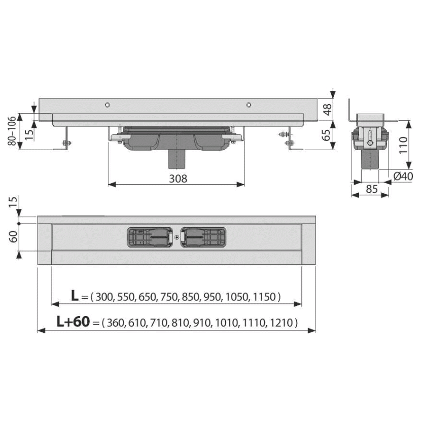 Alcadrain APZ1116-850 WALL LOW liniový podlahový žlab snížený nerez-svislý odpad,ke stěně