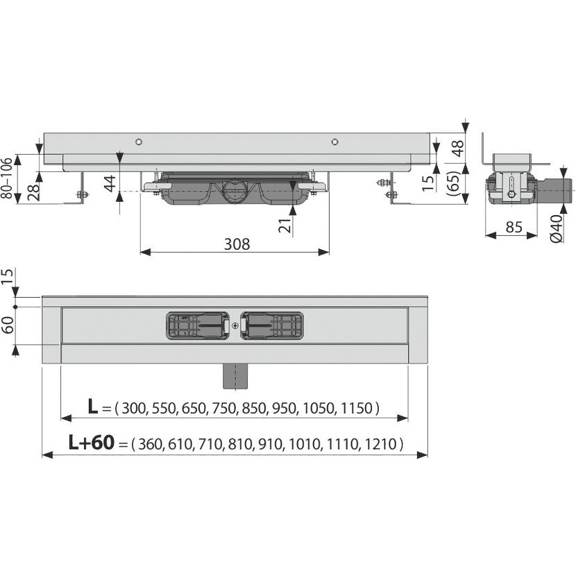 Parametry produktu  Alcadrain APZ116-650 Podlahový žlab s okrajem pro plný rošt a s pevným límcem ke stěně