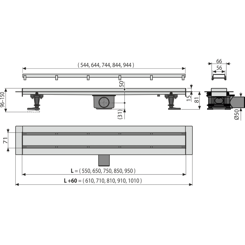 Parametry produktu Alcadrain APZ13-DOUBLE9 -550 Fit and Go podlahový žlab, nerez