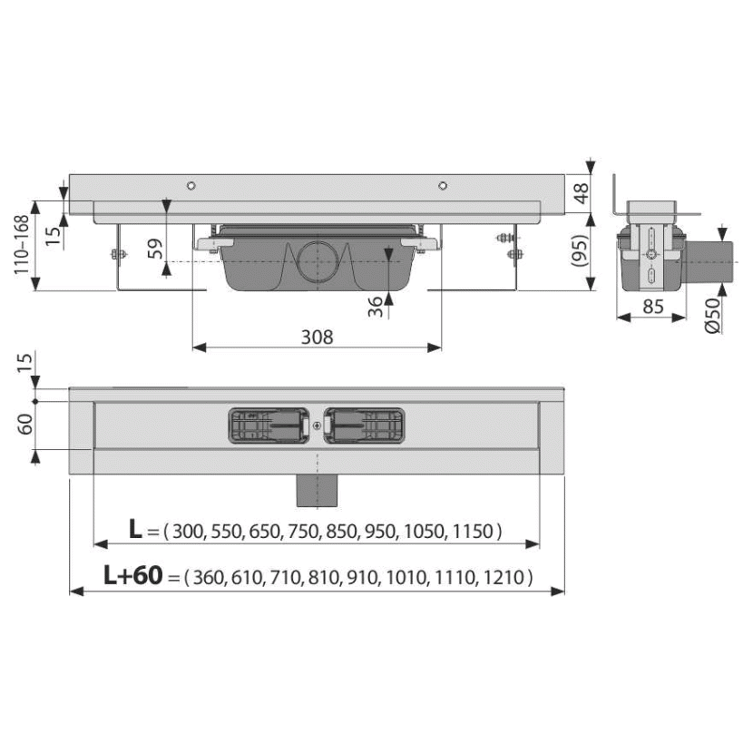 Parametry produktu  Alcadrain APZ16-950 Podlahový žlab s okrajem pro plný rošt a s pevným límcem ke stěně