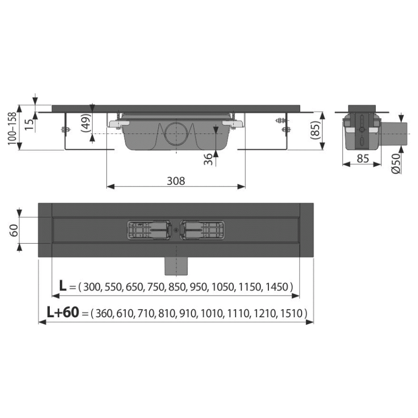 Parametry produktu  Alcadrain APZ1BLACK-650 Podlahový žlab s okrajem pro perforovaný rošt, černá-mat