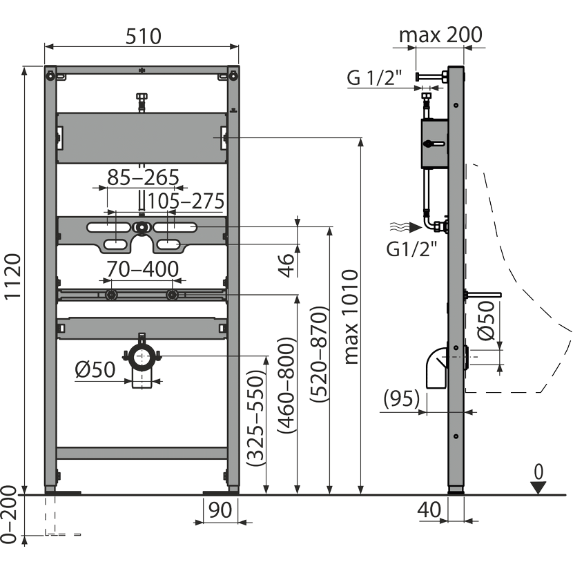 • Rozteč upevnění pisoáru 80–280 mm