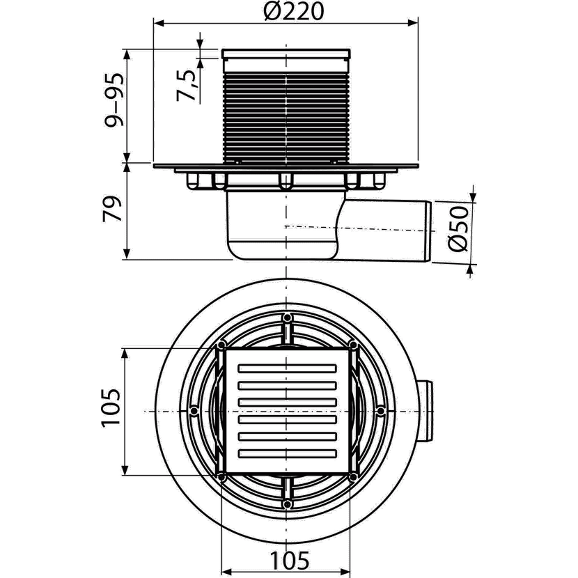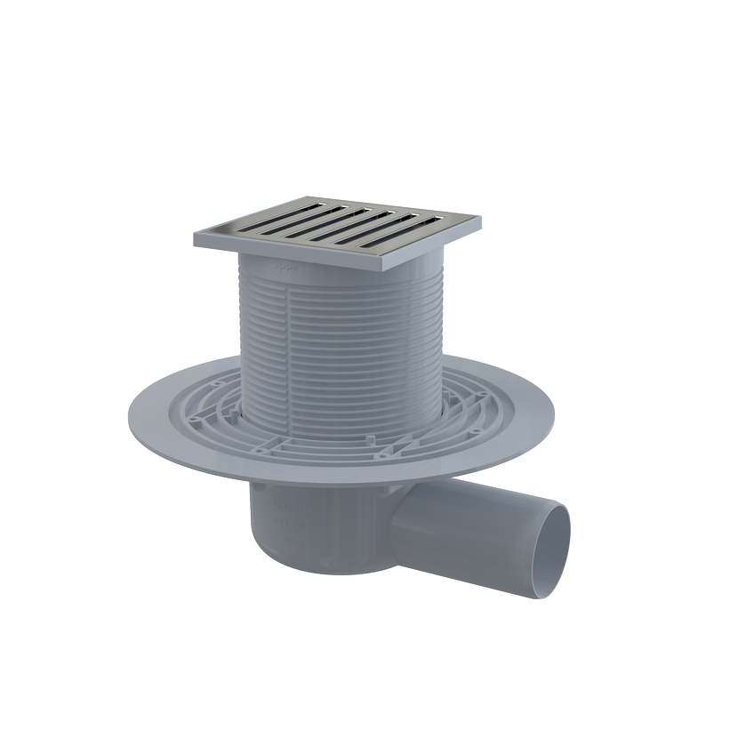 Alcadrain podlahová vpust 105×105/50 mm boční, mřížka nerez, vodní zápachová uzávěra