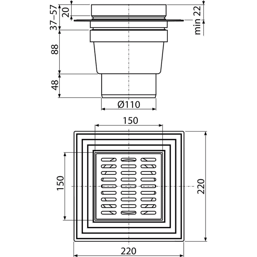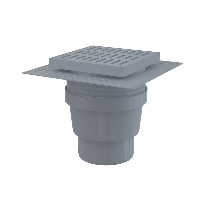 Alcadrain podlahová vpust 150×150/110 mm přímá, mřížka šedá, límec 2. úrovně izolace