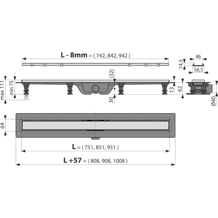 Parametry produktu Alcadrain podlahový žlab s nerezovým okrajem pro oboustranný rošt APZ20-950