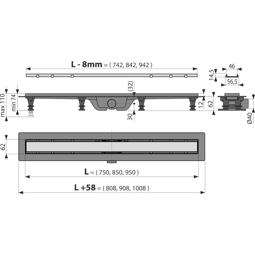Parametry produktu Alcadrain podlahový žlab s okrajem pro oboustranný rošt APZ19-850