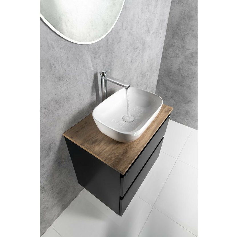 Koupelnový nábytek ALTAIR s deskou ALTAIR (HPL) v dekoru dub emporio a antracit břidlice platin lze kombinovat s umyvadly na postavení.