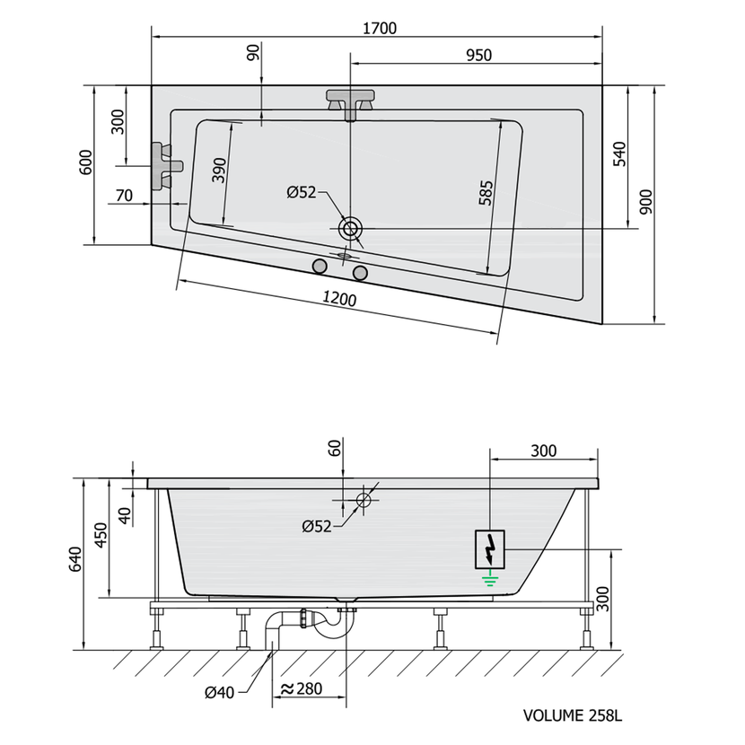 Parametry produktu ANDRA R hydromasážní vana, 170x90x45cm, Active Hydro-Air, chrom