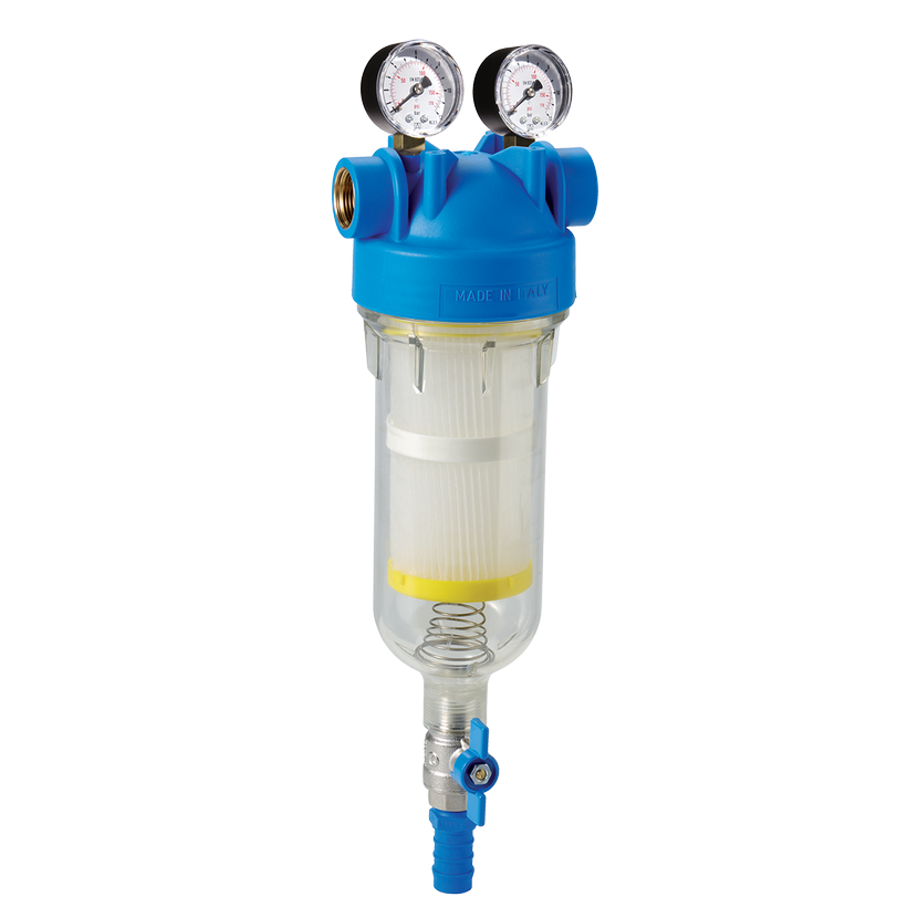 Samočistící filtr se 2 manometry a zpětným proplachem.
