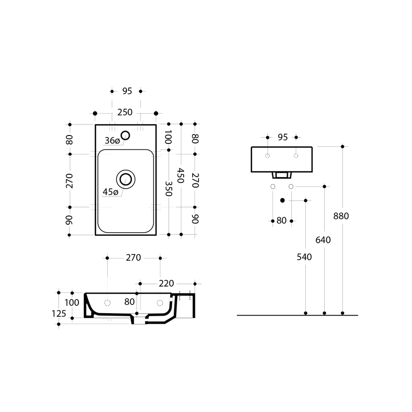 Parametry produktu CENTO keramické umývátko 45x25cm, pravé/levé, bílá