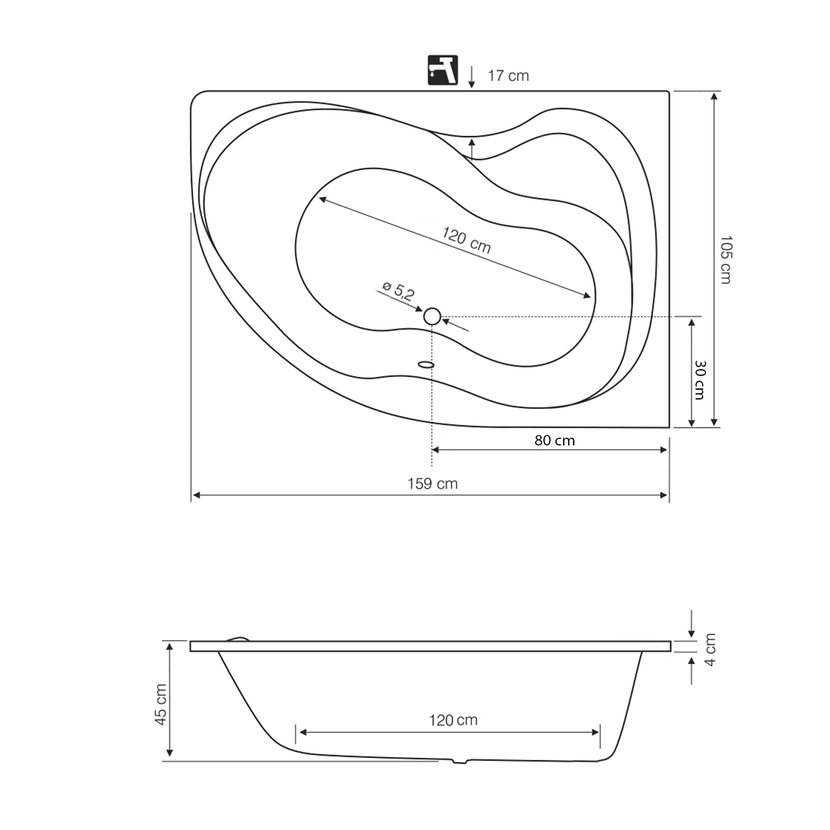 Parametry produktu CIDLINA 160 vana 160x105x45cm, pravá, bílá