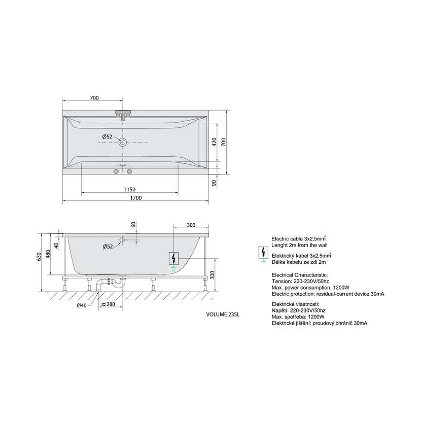 Parametry produktu CLEO hydromasážní vana, 170x70x48cm, Highline Hydro, chrom