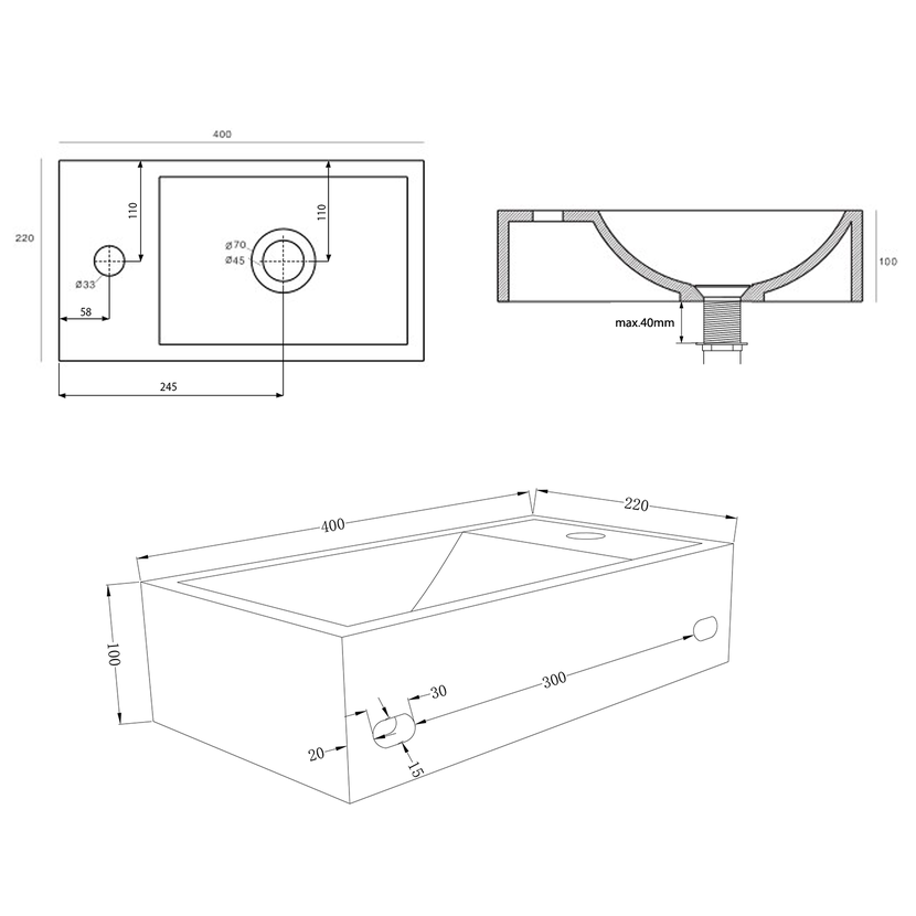 Parametry produktu CREST L betonové umývátko, nástěnné, včetně výpusti, 40x22cm, černý granit
