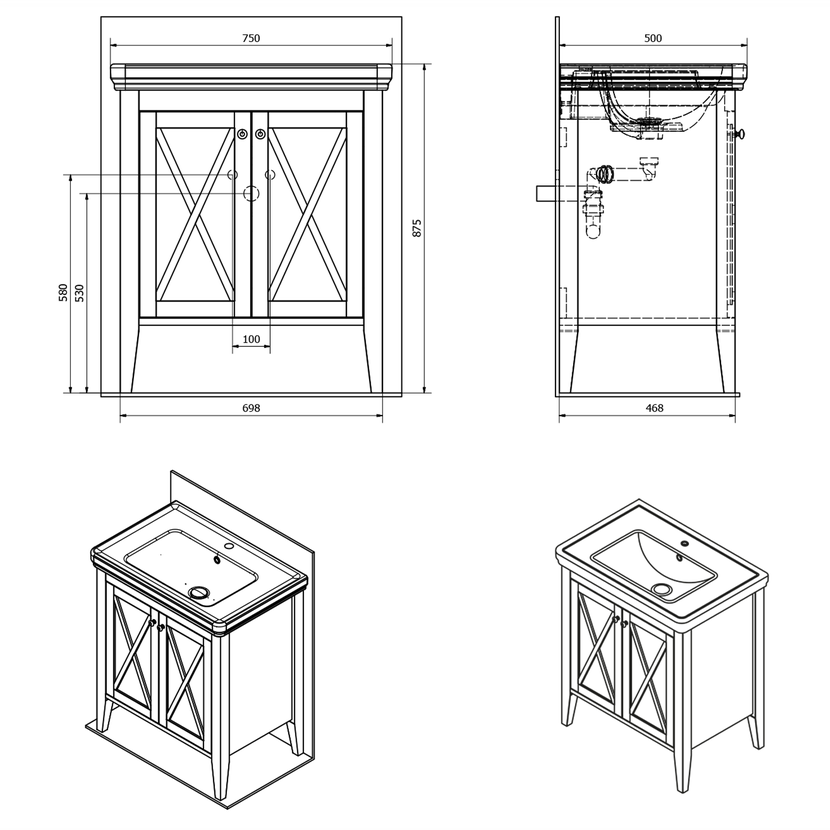 Parametry produktu CROSS umyvadlová skříňka 70x81x47cm, starobílá