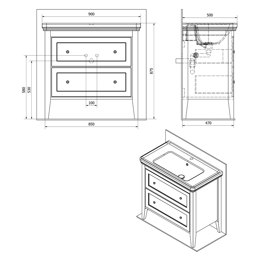 Parametry produktu CROSS umyvadlová skříňka 85x81x47cm, 2x zásuvka, starobílá