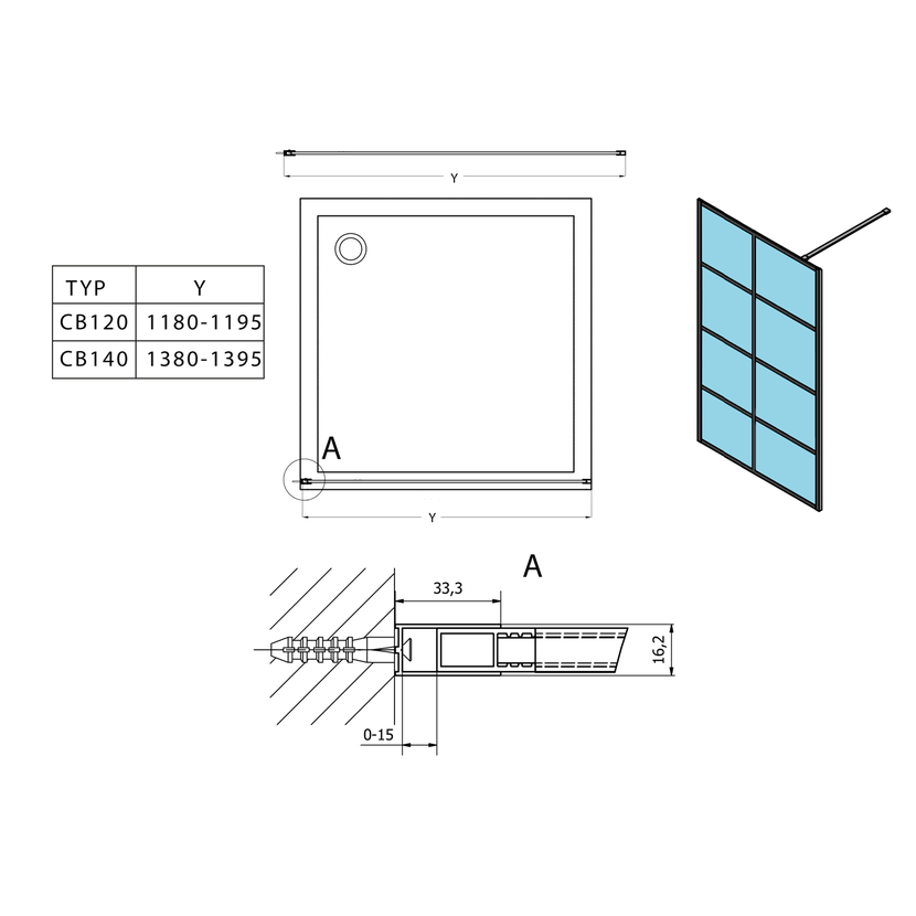 Z vnější strany je sklo orámováno černým matným rámem a opticky rozděleno vodorovnými profily na 4 okna. Zástěny o šířkách 1200 a 1400 mm jsou navíc opatřeny svislým profilem, takže zástěna je rozdělena na 8 tabulek. Z vnitřní strany je zástěna dokonale hladká a pro snadnou údržbu ošetřena povrchovou úpravou Coated Glass. Všechny zástěny lze navíc doplnit o pevný přídavný panel.