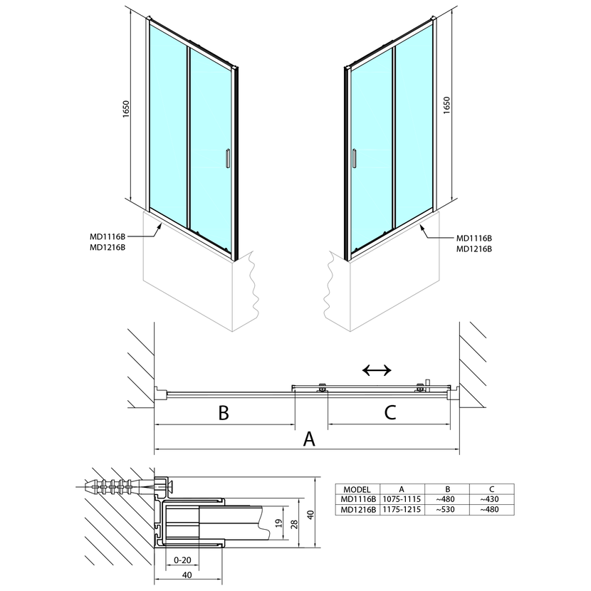 • Snadná montáž, tolerance 20 mm nastavením skel v profilu
