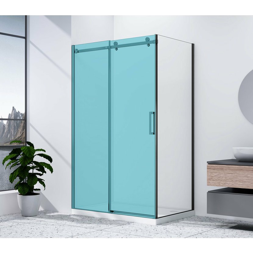 Dveře z bezpečnostního skla jsou zavěšeny a jejich pohyb usměrňuje vodící díl na podlaze. Je tak umožněn bezbariérový vstup.