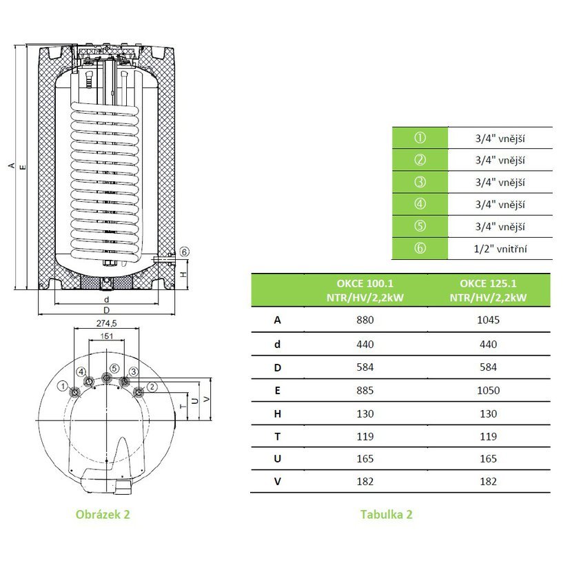 - elektrické krytí: IP 42 - horní vývody výměníku - OKC – válcové zásobníky vody - pro přípravu TUV v objektech s plynovým kotlem
