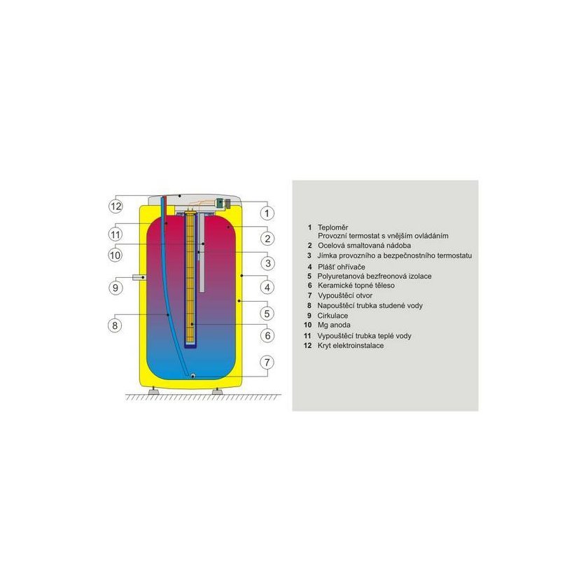 Stacionární ohřívač vody umožňující instalaci topných těles, dostupný též ve velkokapacitním provedení s objemem 1000 litrů.