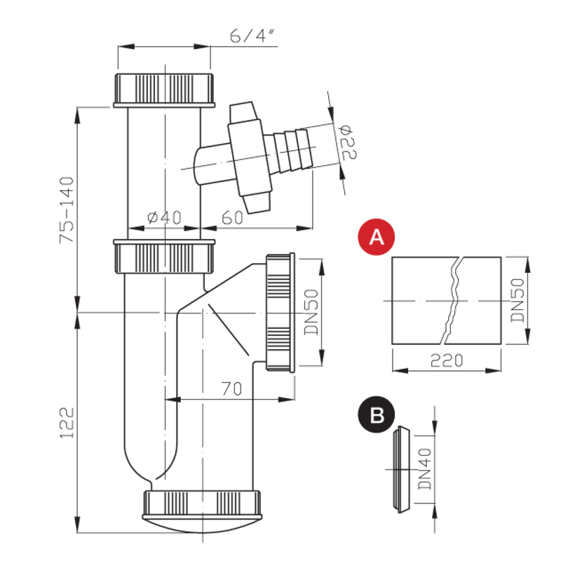 Dřezový sifon s odbočkou 6/4", DN50, bílá