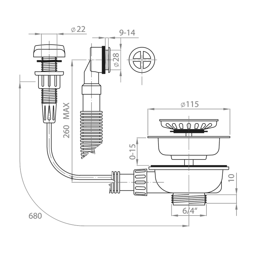 Dřezový výtokový ventil, 6/4/ x115, ovládání, přepad kruh