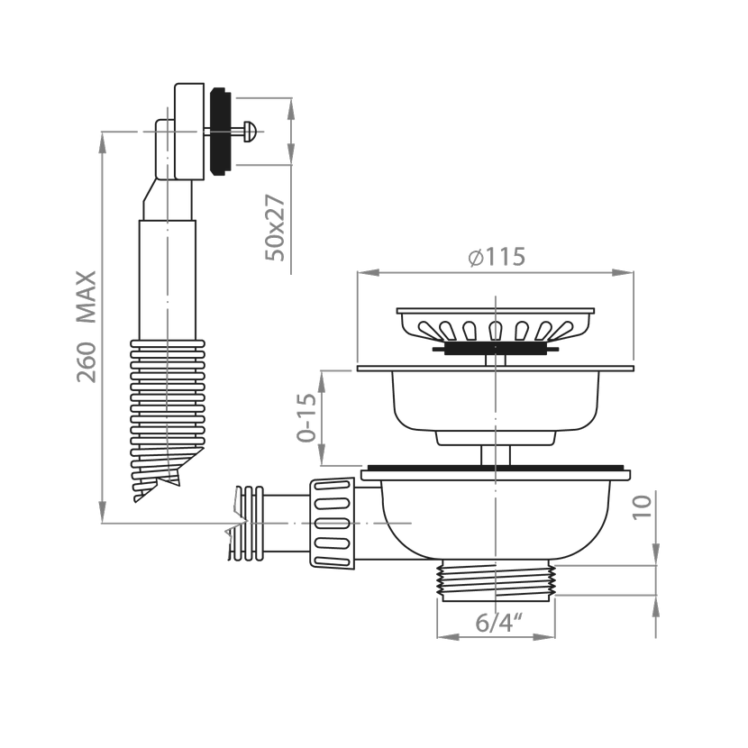 Dřezový výtokový ventil, 6/4" x115, přepad boční/vrchní