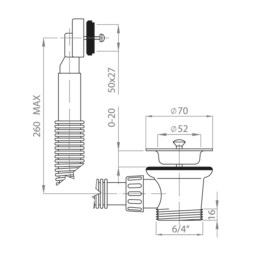 Dřezový výtokový ventil 6/4" x70, přepad boční/vrchní