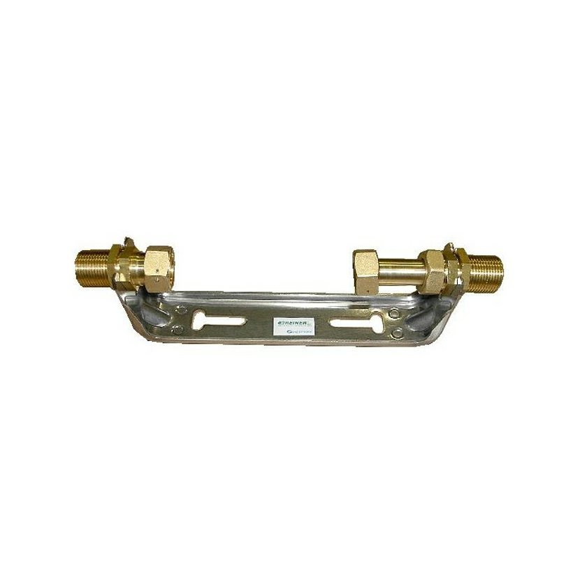 Držák vodoměru Italského výrobce Greiner, včetně mosazného připojovacího šroubení. Šroubení je na jedné straně pevné a na druhé teleskopické. Závity 1" x 3/4". Celková délka držáku 345mm, DN 3/4".