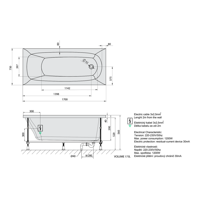 Parametry produktu EBRO hydromasážní vana, 170x75x39cm, Highline Hydro-Air, chrom