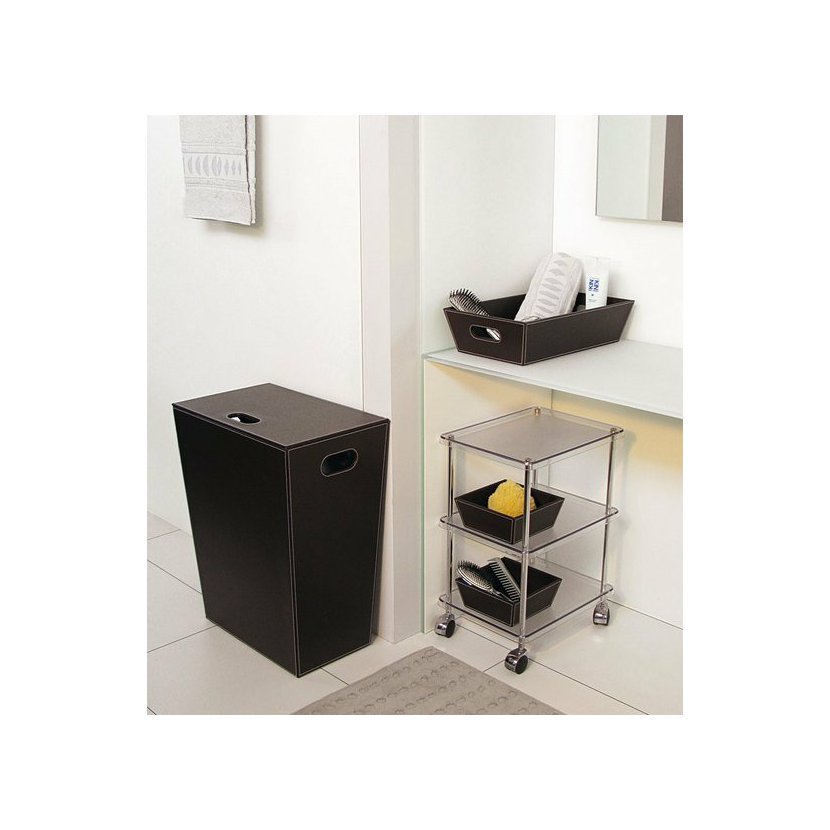 Stylové doplňky pro koupelnu v moderních barvách, vyrobené ze dřeva potaženého syntetickou kůží. Dokonalé zpracování je podtrženo ozdobným švem. Prádelní koš ECO PELLE se stane nepostradatelnou součástí koupelny.