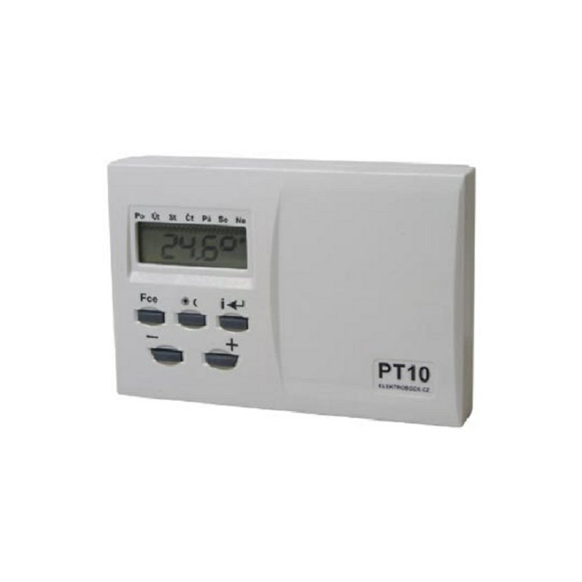 je digitální prostorový termostat pro automatickou regulaci vytápění s možností nastavení 4 teplotních změn na každý den (minimální nastavitelný časový úsek je 30 minut). Výhody PT10: