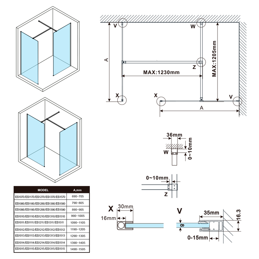 Stěnové profily s tolerancí 15 mm usnadňují stabilní montáž zástěn, instalace je možná na dlažbu nebo sprchovou vaničku