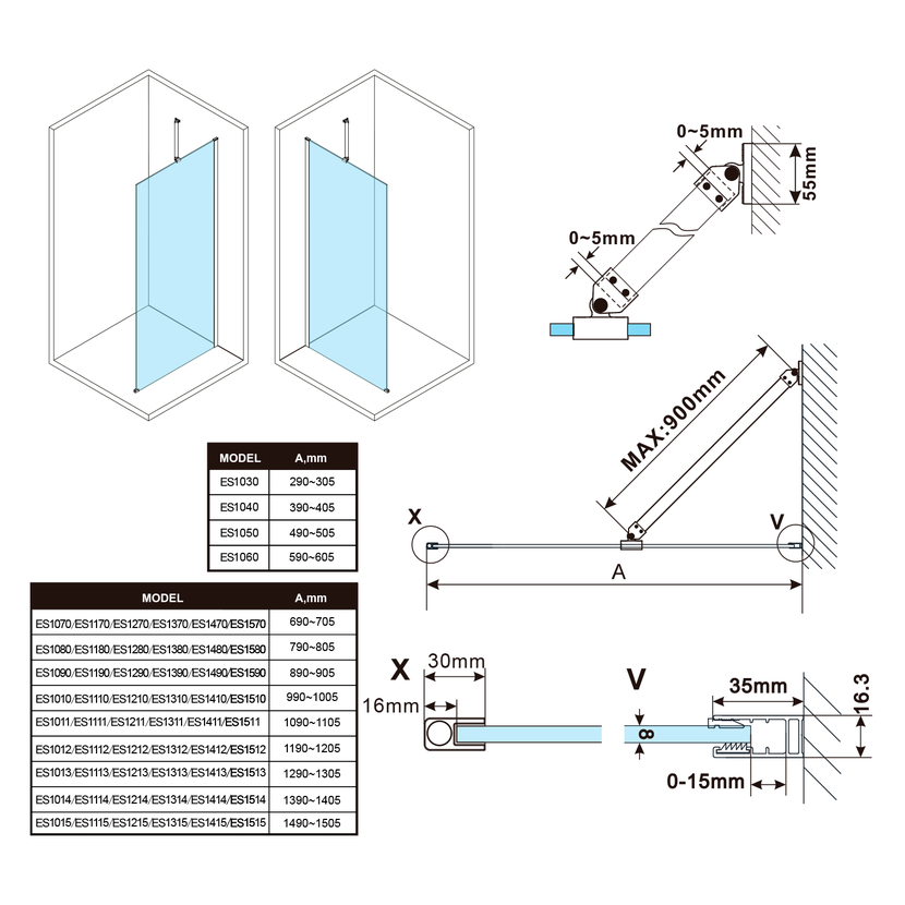 Stěnové profily s tolerancí 15 mm usnadňují stabilní montáž zástěn, instalace je možná na dlažbu nebo sprchovou vaničku