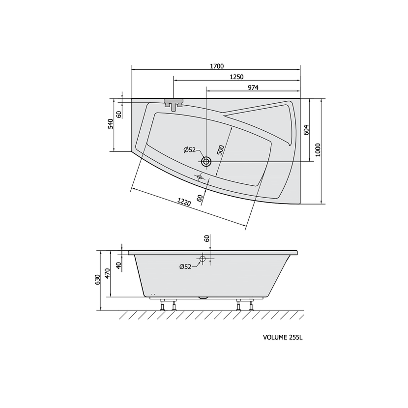 Parametry produktu  EVIA R asymetrická vana 170x100x47cm, bílá