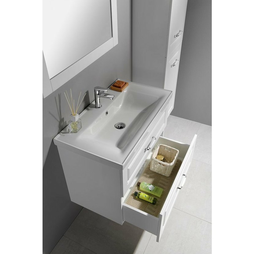 FAVOLO je klasická série koupelnového nábytku s decentně frézovaným dekorem na čelech zásuvek a dvířkách v bílém matném provedení. Umyvadlové skříňky lze kombinovat se zrcadly a doplňkovými skříňkami ve stejném stylu a odstínu. Elegantní umyvadla podtrhují vzhled celé série, která se hodí nejen na chalupu či do činžovního domu ze začátku 20. století.