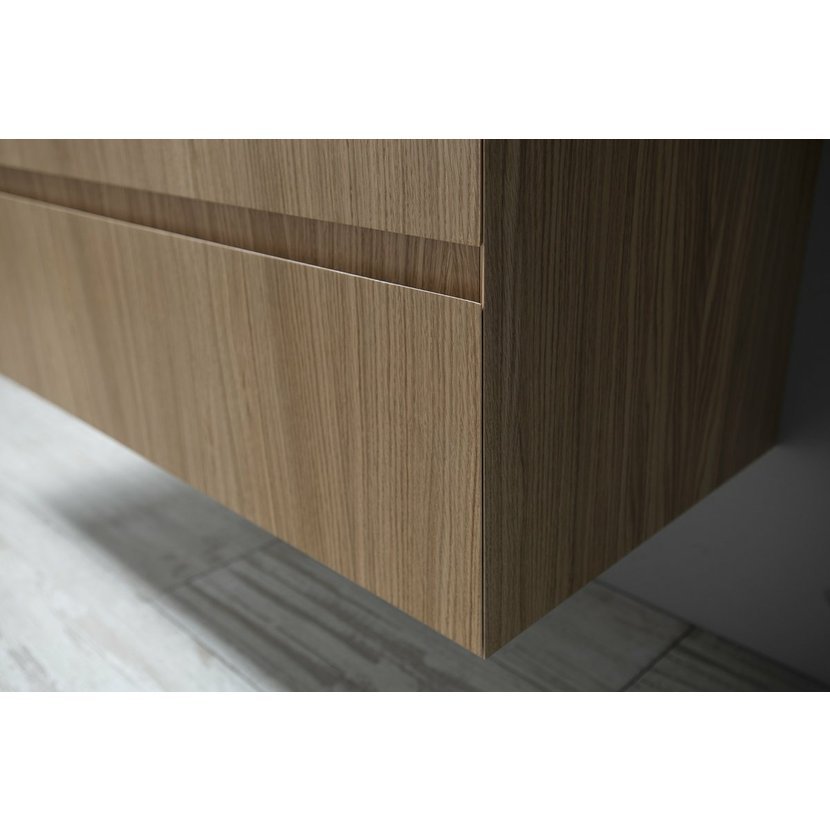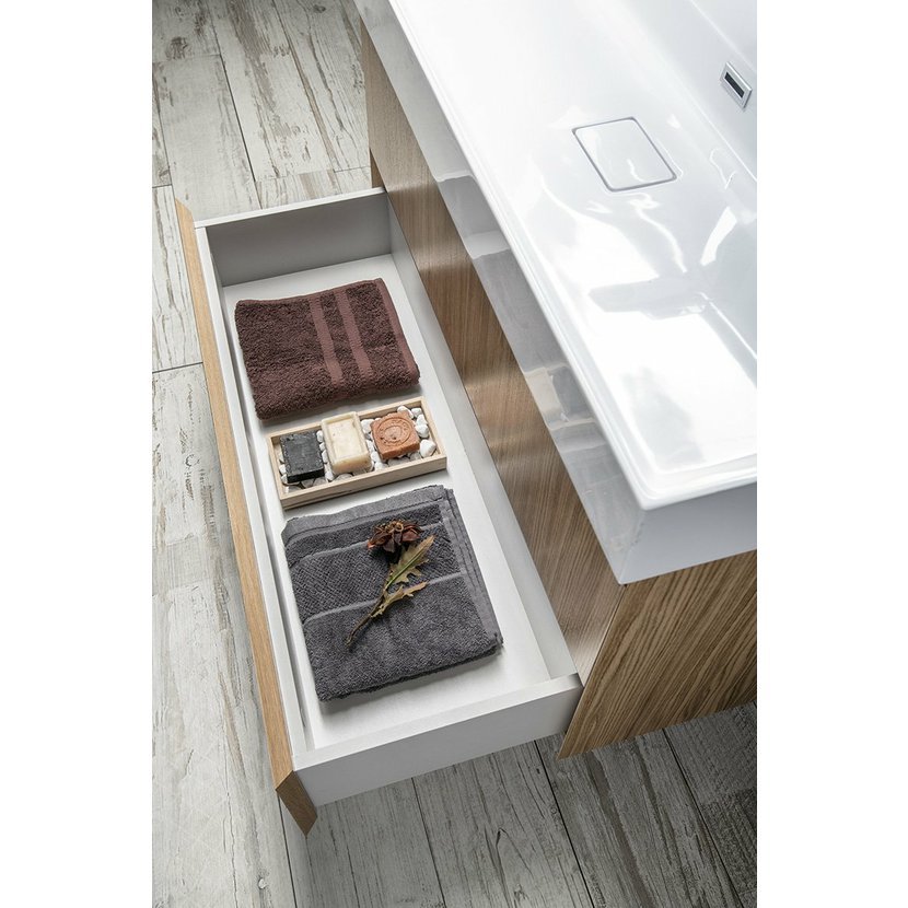 Dokonale decentní série koupelnového nábytku FILENA nabízí skříňky z dubové dýhy v přírodním provedení dekoru dřeva ošetřeném transparentním lakem, v bílém matném lakování a v černě matném lakovaném drážkovaném designu. Ostré zkosené hrany pod úhlem 45° čel zásuvek a dvířek vytváří tenkou linii, která je pro sérii charakteristická. Čistý design není rušen úchytkou, pohodlné otevírání umožňuje zkosená hrana a otvor mezi zásuvkami.