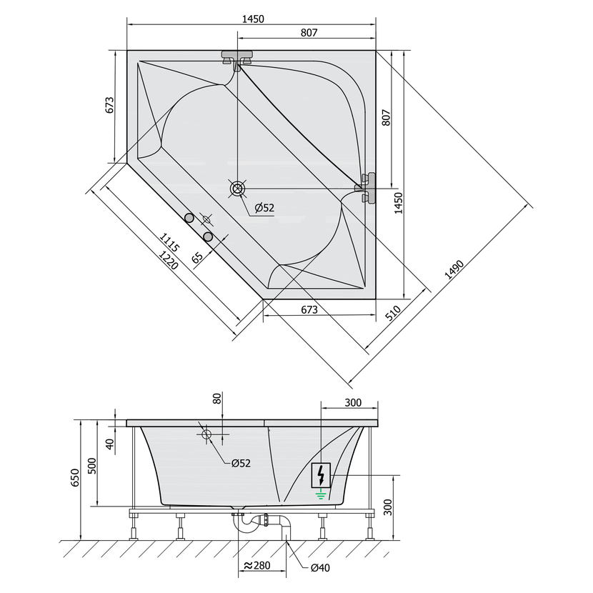Parametry produktu FLOSS hydromasážní vana, 145x145x50cm, Active Hydro-Air, chrom