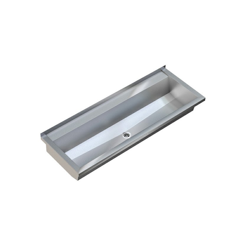 PLANOX mycí žlab beze spár svařený, k montáži na omítku, chromniklová ocel 1.4301, povrch hedvábně matný, tloušťka materiálu: žlab 0,8 mm / boční stěny 1,2 mm, boční stěny s integrovanými nástěnnými konzolami, s plochou pro baterie, bez přepadu, zadní lem 40 mm, odtok středový, sítkový ventil G 1 1/2 B, včetně upevňovacího materiálu.