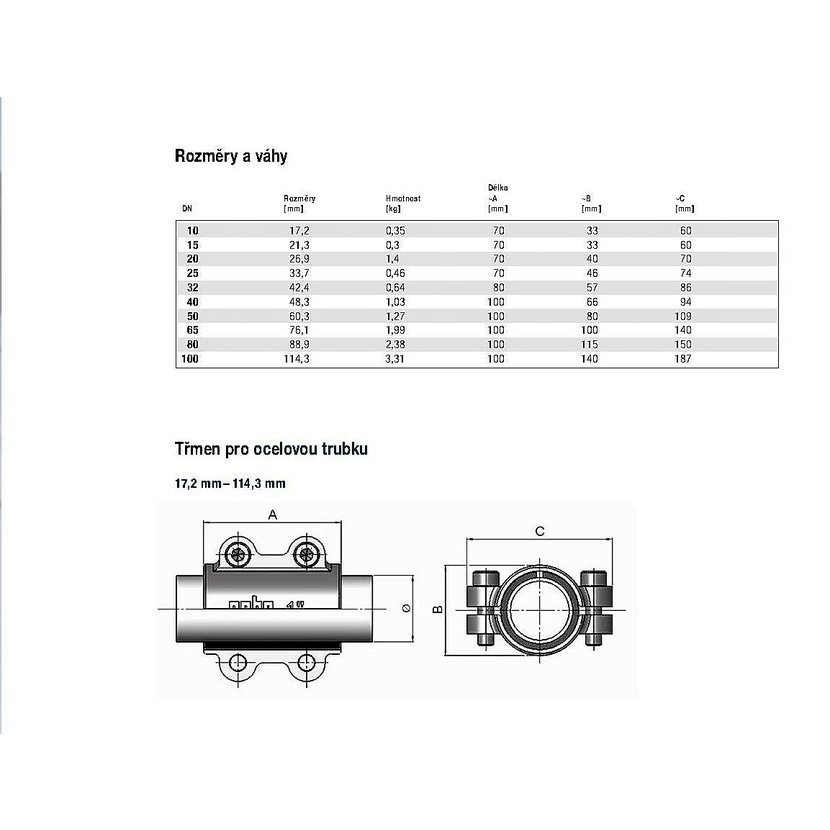 Pro ocelové trubky: DIN EN 10255 (DIN 2440, 2441, 2442) a DIN 2448/1 a 2458/1, ISO 65 nebo řady s odpovídajícími vnějšími průměry . Max. provozní tlak / teplota: Voda 16 bar / 60 °C, 6 bar / 90 °C Médium: Pitná a provozní voda Použitelnost: Těsnění jsou vhodné pro těsnění děr a prasklin způsobených například korozí nebo mechanickým poškozením . Těsnění odpovídá doporučením KTW a je schváleno pro pitnou vodu ! Certifikace: Pro voda: Reg.-č.: B-30-00322-09-rev.2 Rozměry : - DN 48,3 mm - A 100 mm - B 66 mm - C 94 mm